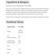 Corn syrup, sugar, dextrose, modified food starch, contains less than 2% of: malic acid (E296), sodium citrate (E331), apple juice concentrate, watermelon juice concentrate, strawberry juice concentrate, natural flavours, artificial flavours, gum arabic (E414), carnauba wax (E903), colour (E120, E133, E129, E102, E110, E132, E171).