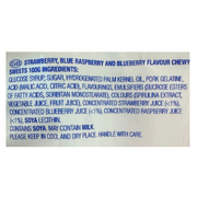 Glucose syrup, Sugar, Hydrogenated palm kernel oil, Pork gelatine, Acid (Malic acid, Citric acid), Natural and artificial flavours, Emulsifiers (Sucrose esters of fatty acids, Sorbitan monostearate), Colours (Spirulina extract, Vegetable juice, Fruit juice), Concentrated strawberry juice (<1%), Concentrated blueberry juice (<1%), Concentrated raspberry juice (<1%), SOY lecithin.