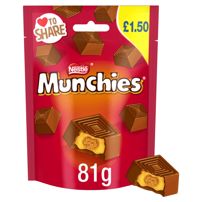 MUNCHIES® sharing bag, delicious milk chocolate cubes encasing a soft caramel & crunchy biscuit centre, making them the ideal treat to share with family and friends. MUNCHIES® were originally created by Mackintosh's and were launched into the UK market in 1957. Over the years there have been a number of different flavour variants launched under the MUNCHIES® brand, including Chocolate Orange in 1977 and Banoffee in 1996. However, the original has remained consistently the favourite flavour within the range.