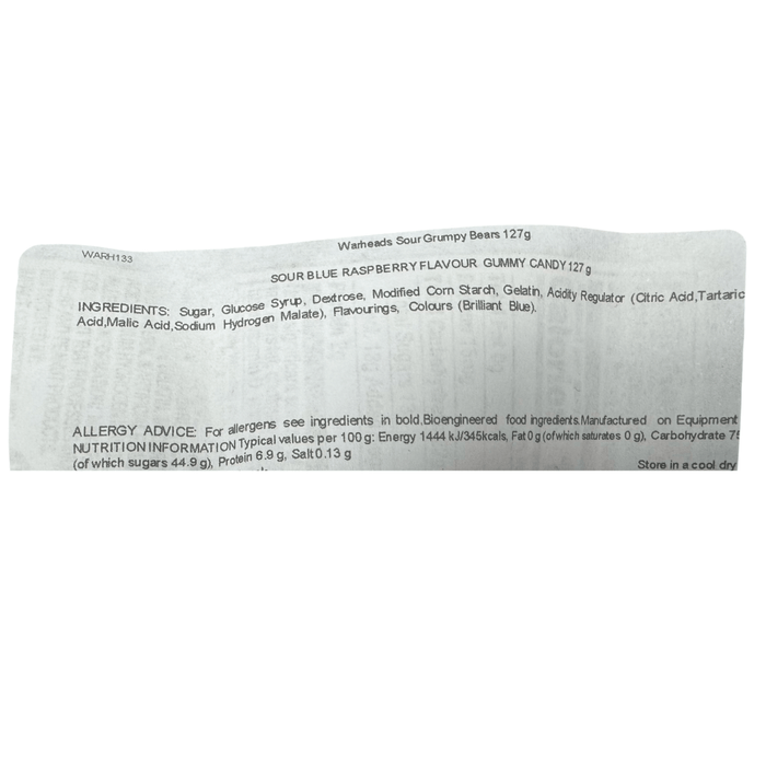 Sugar, Glucose Syrup, Dextrose, Modified Corn Starch, Gelatine, Acidity Regulator (Citric Acid, Tartaric Acid, Malic Acid, Sodium Hydrogen Malate), Flavourings, Colours: Brilliant Blue (E133).